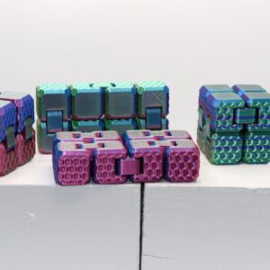 • Infinity Cube fidget toy folding cube with black panels for stress relief.