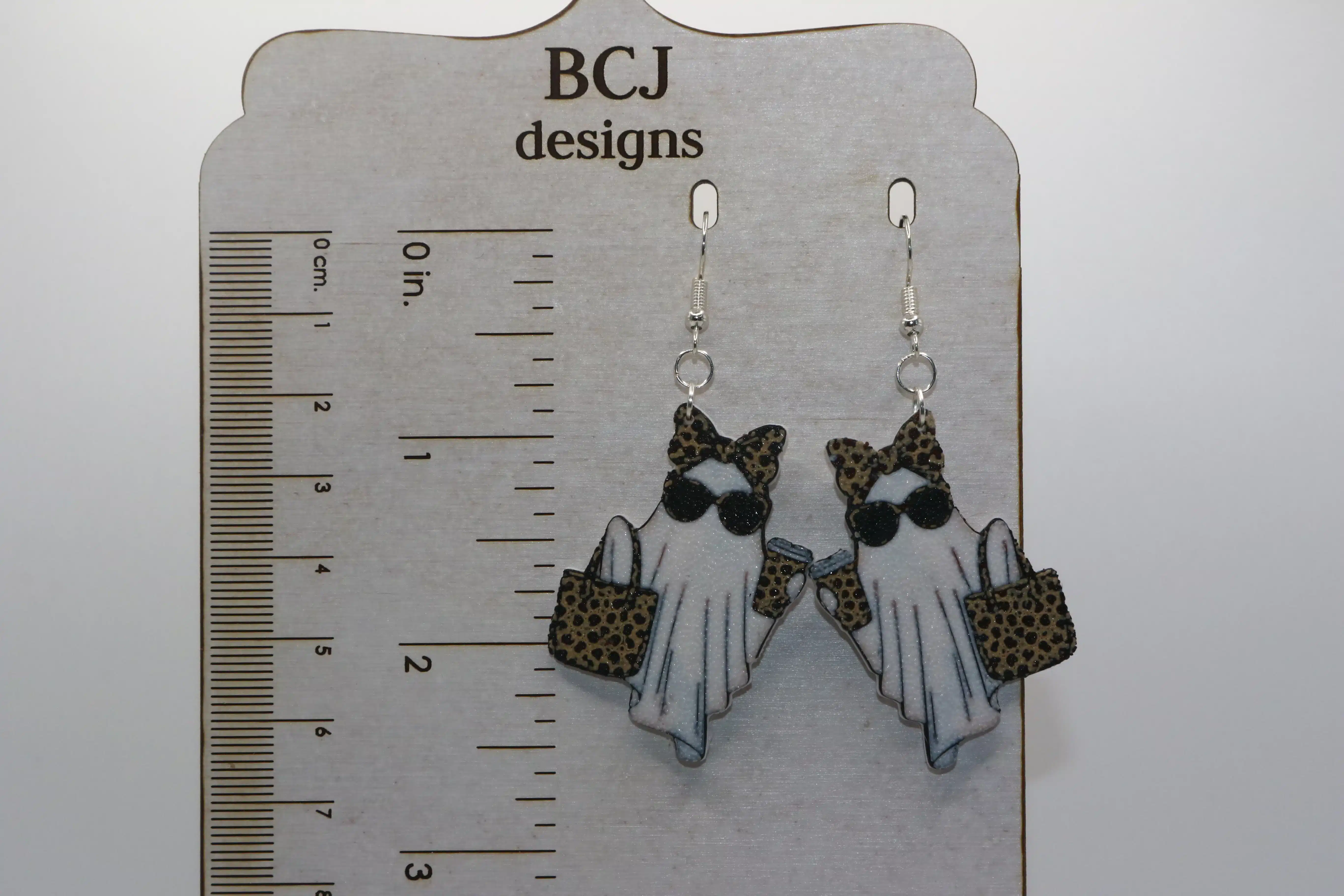 Fashionable Boo Gee Ghost Earrings with bold leopard-print accents