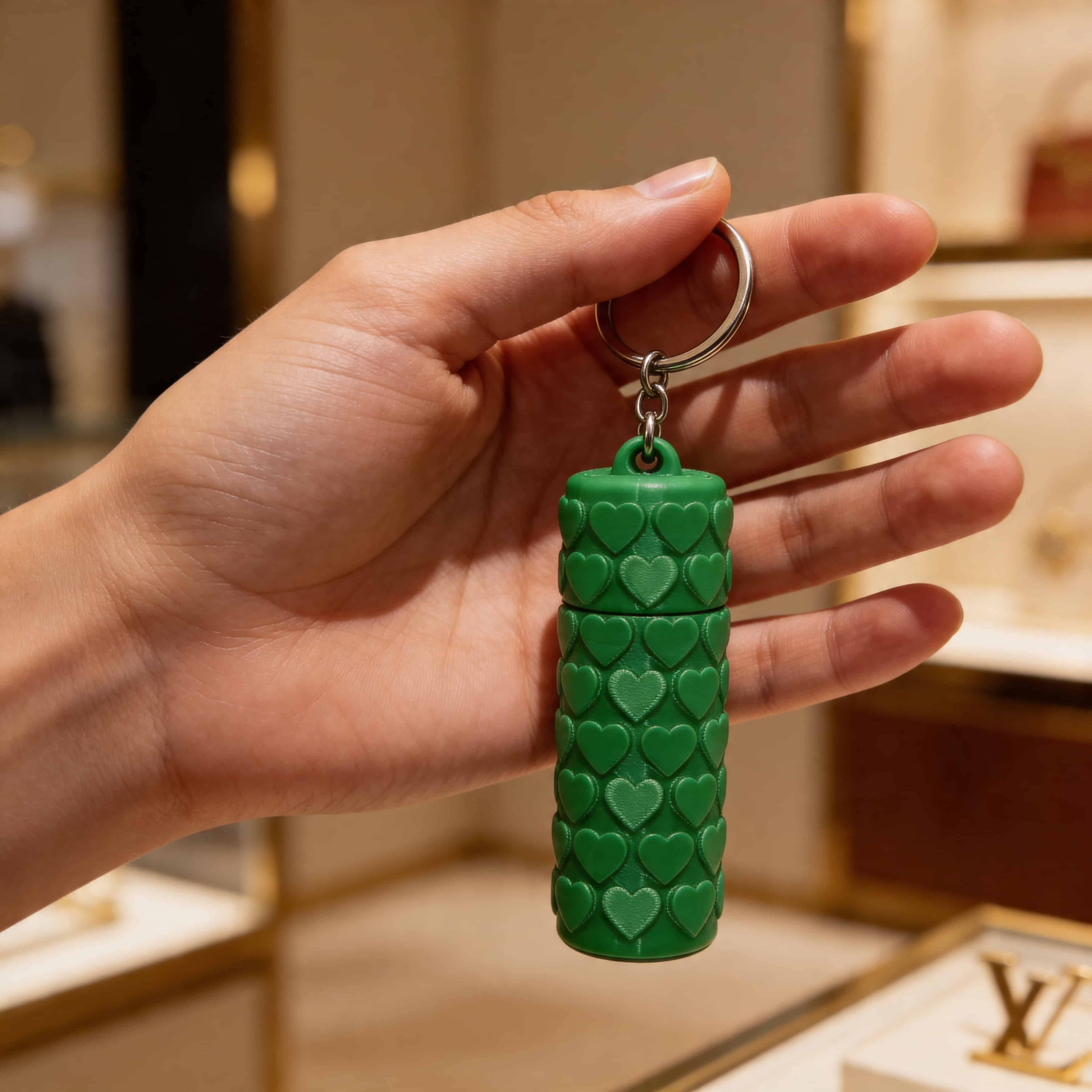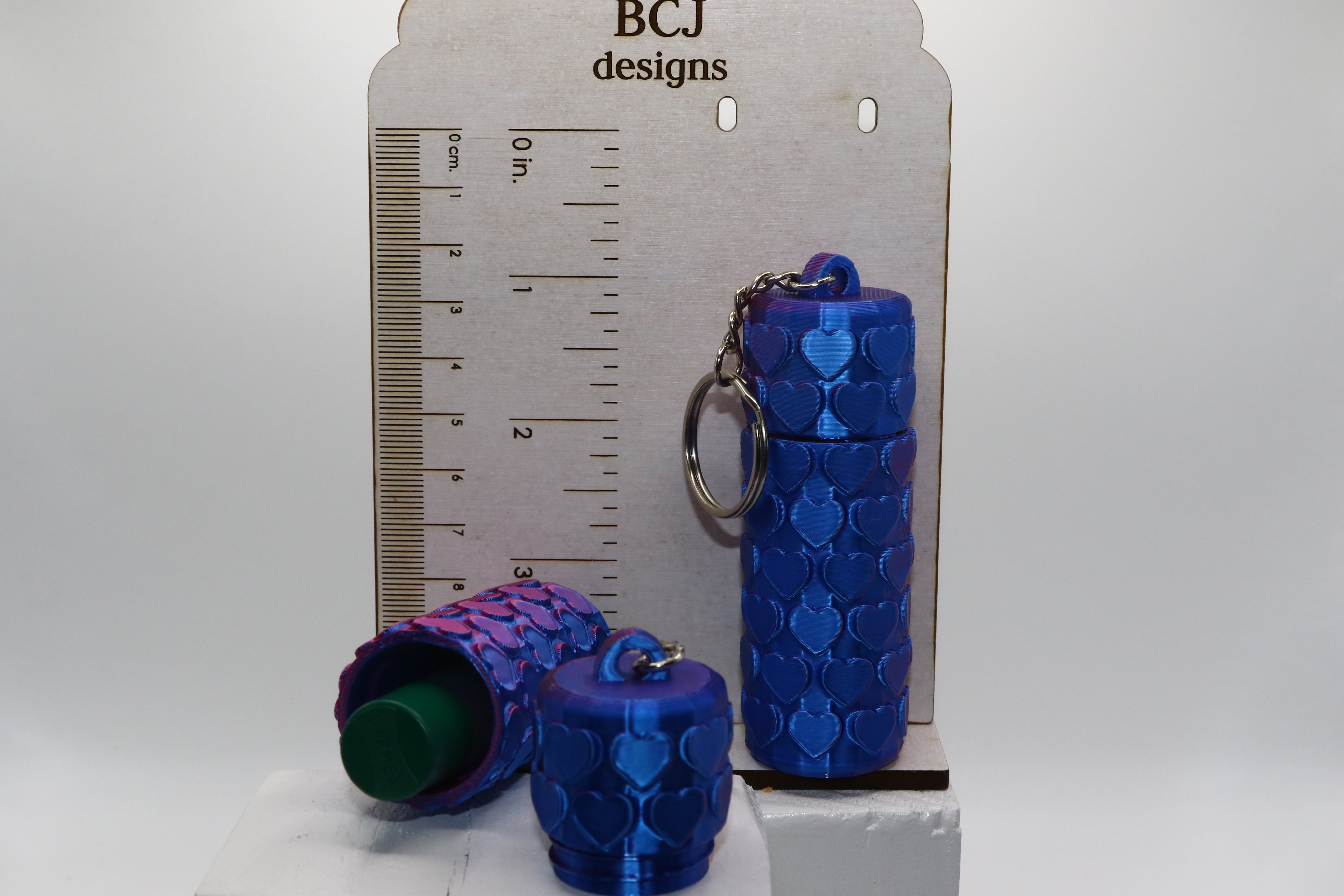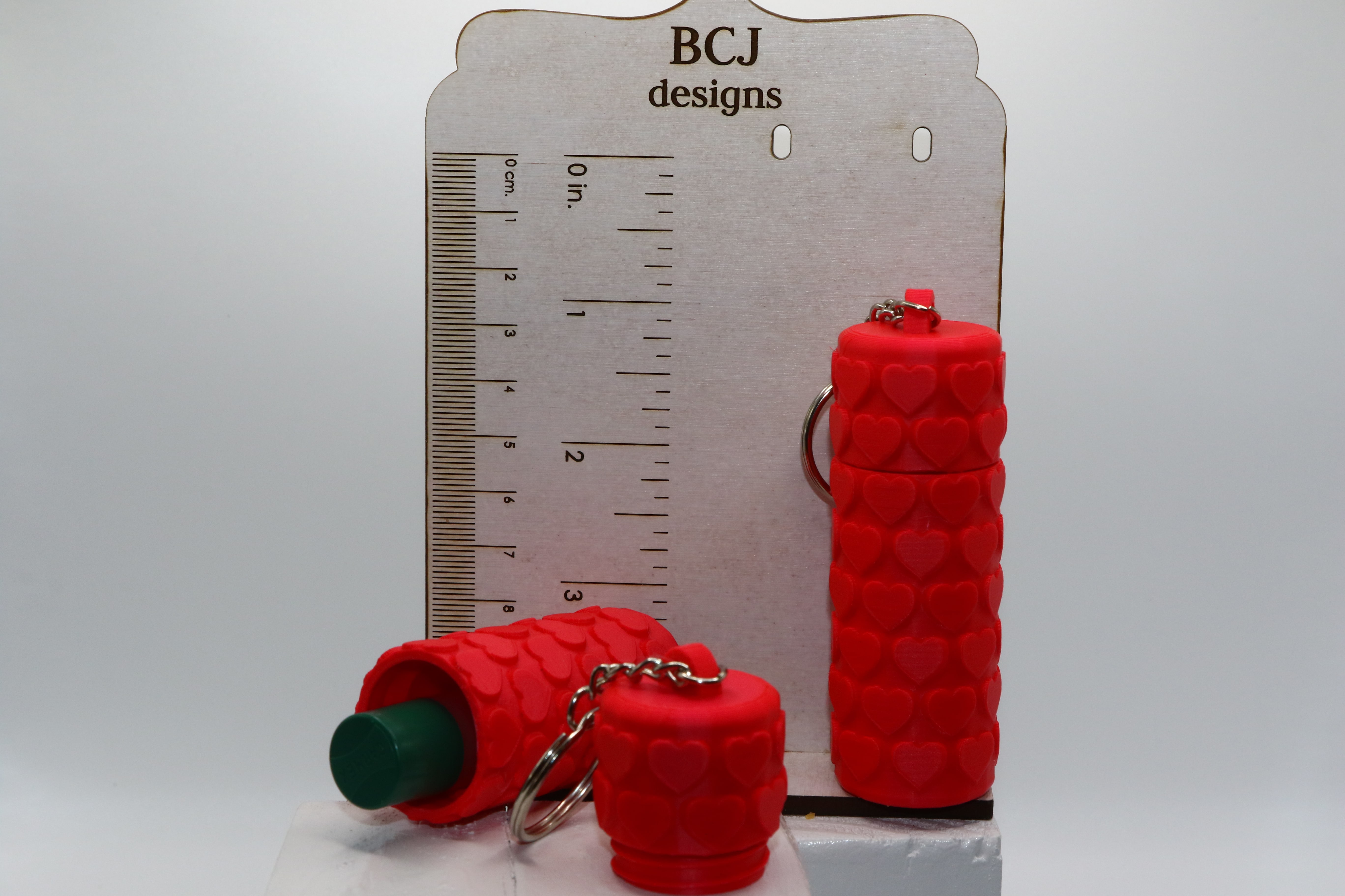 The raised heart texture adds dimension and grip while giving the design a bold, eye-catching look. Lightweight but durable, this Chapstick Holder Keychain is practical for daily carry and stylish enough to stand out.