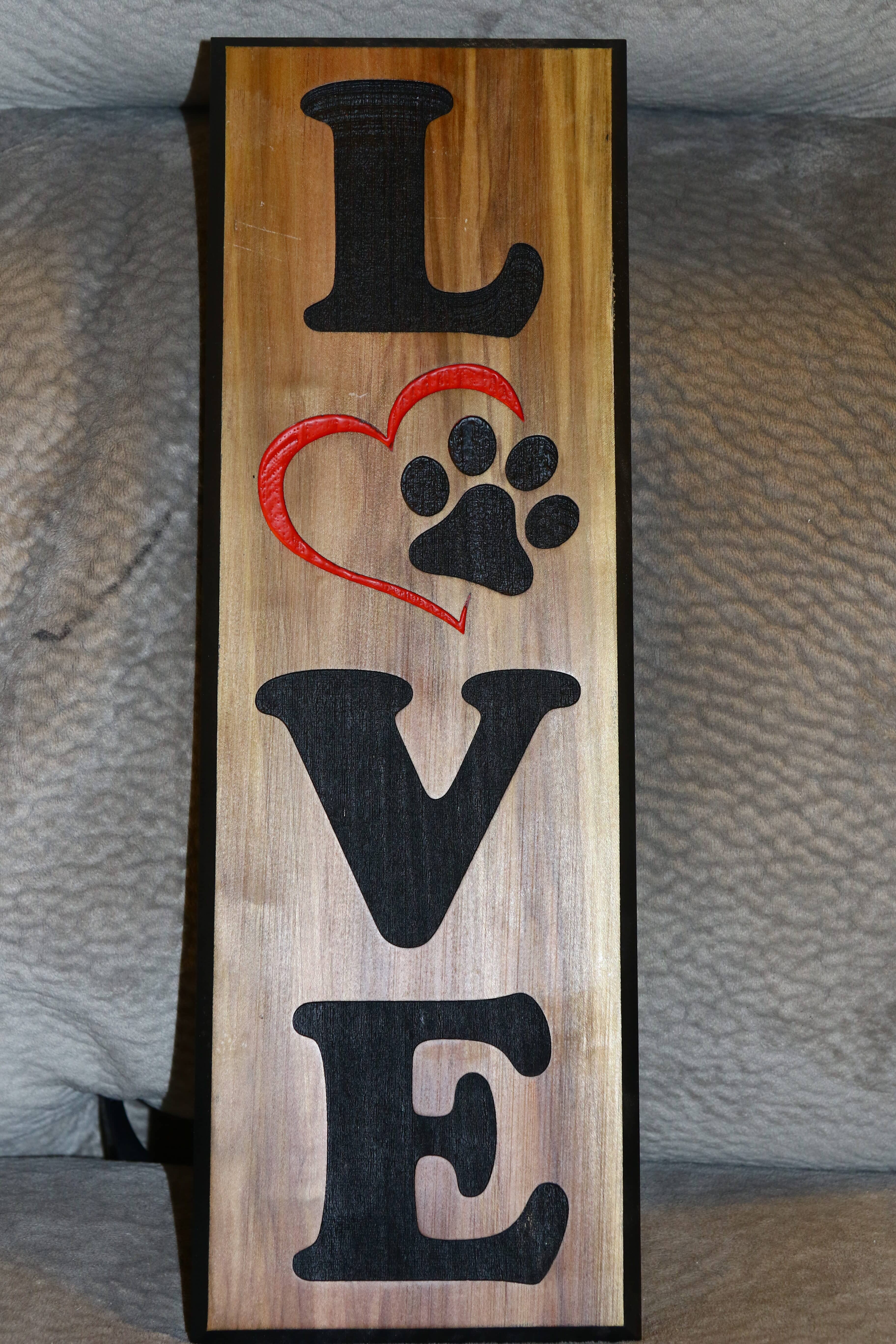 Heart and paw motif engraved on poplar wood