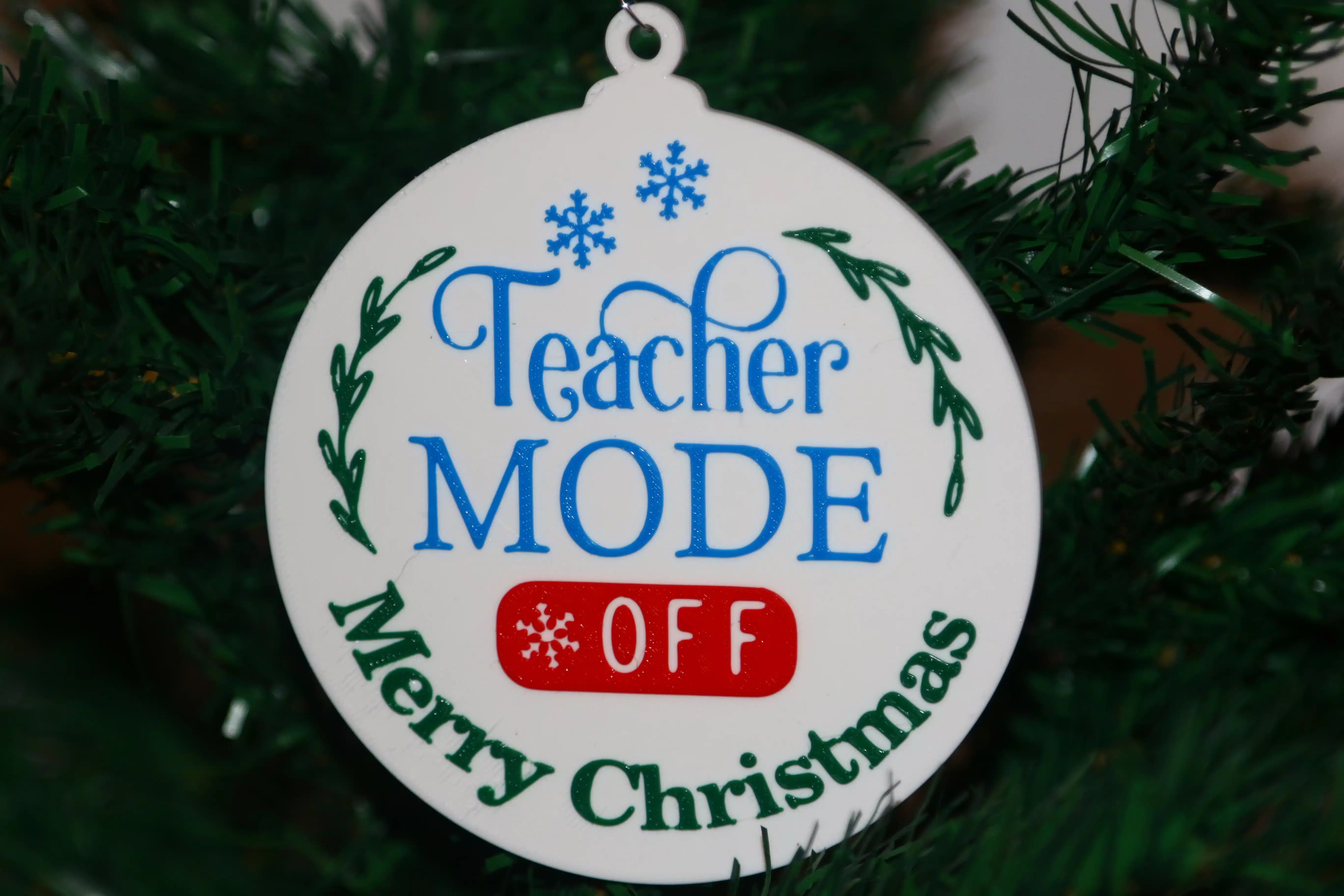 The Teacher Christmas ornament brings playful humor and festive charm to holiday décor. Featuring the witty phrase “Teacher Mode Off,” this ornament is perfect for educators, students, or anyone who enjoys lighthearted classroom humor during the holiday season. Its colorful design and clever message make it a standout piece on Christmas trees, shelves, or holiday displays.