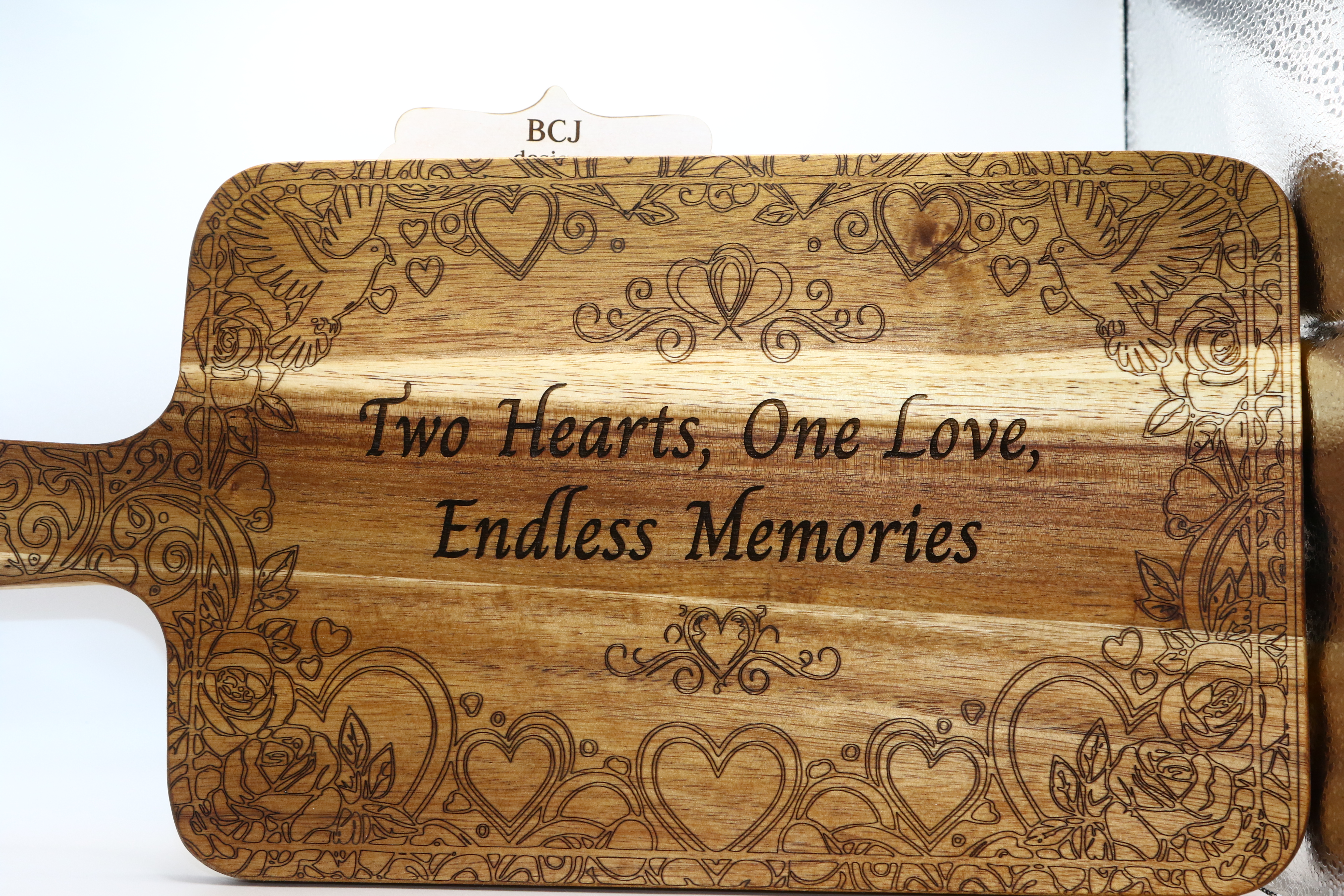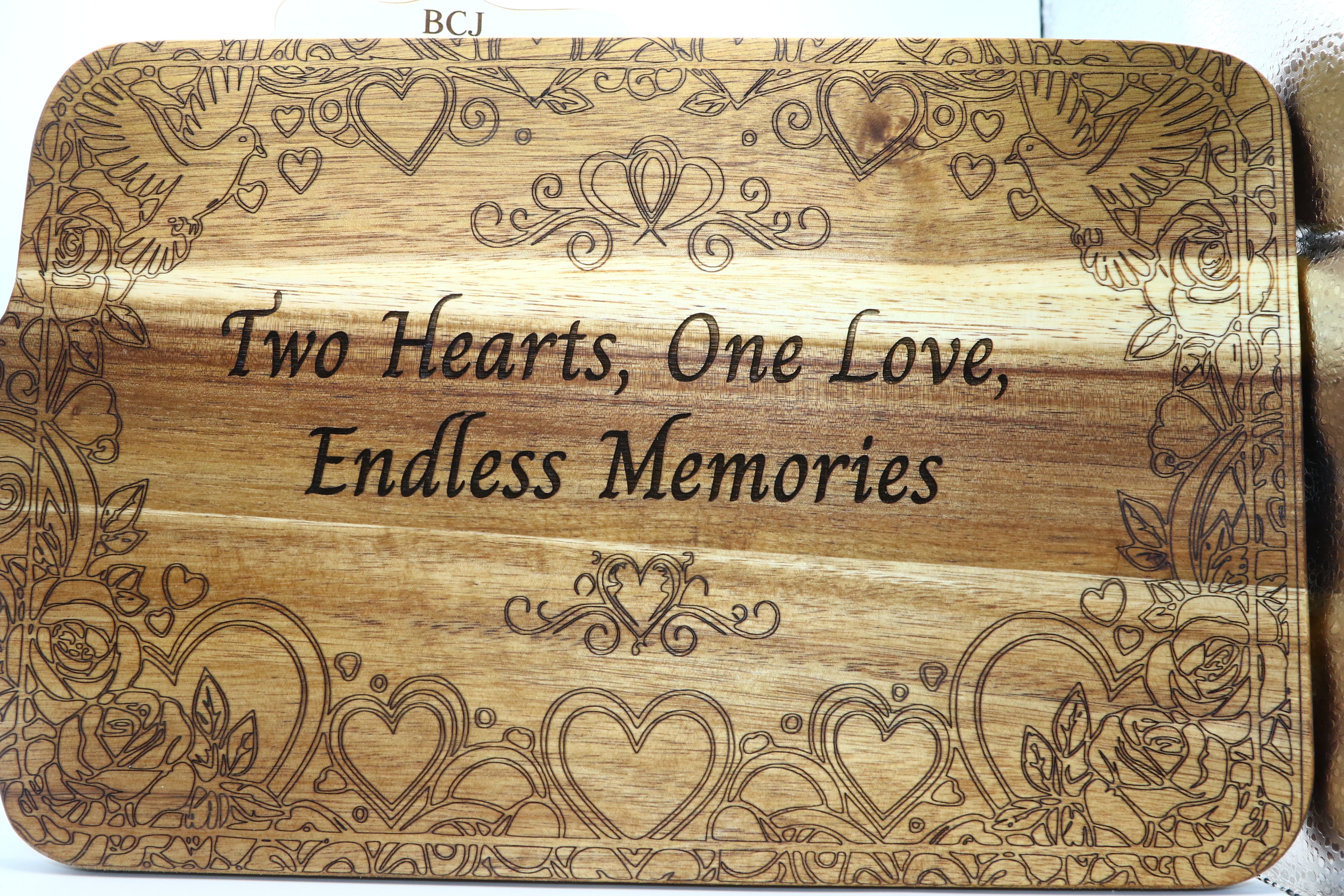 The edges feature a finely engraved border of hearts, delicate birds, and blooming roses, adding whimsical charm that enhances any display. The back is left plain, allowing it to double as a fully functional serving board for cheeses, fruits, or appetizers.